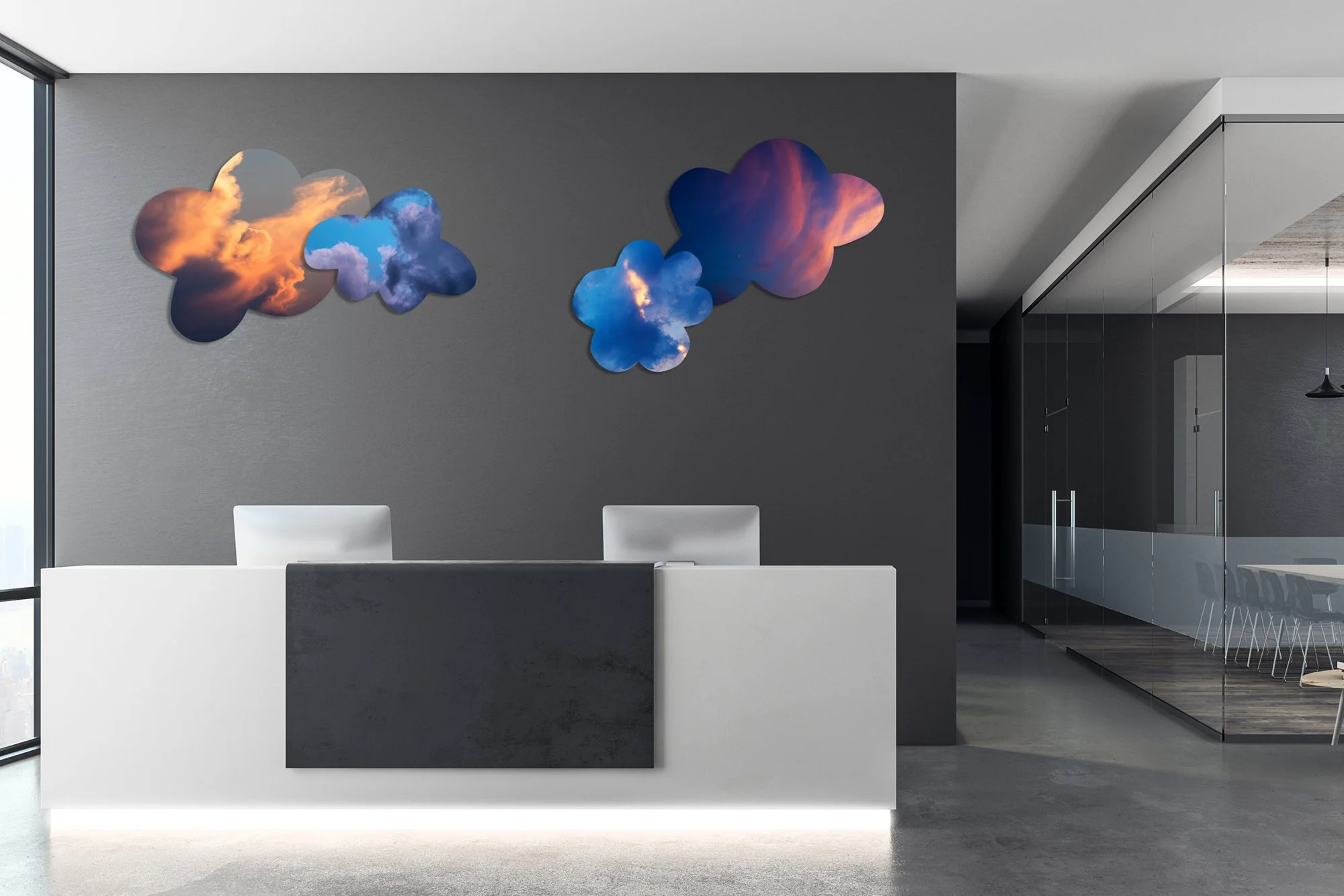 The sky can fill your space in many different ways. From window vinyl to window cling installations to cut shapes, the For the LOVE of Clouds collection invites a new way to experience art: functional, luminous, and alive with movement. These unique display options reshape how we experience art in our everyday spaces. They transform glass into a canvas and turn dull scenes into skyward views. More than décor, it’s an atmosphere that invites a new way to experience art.