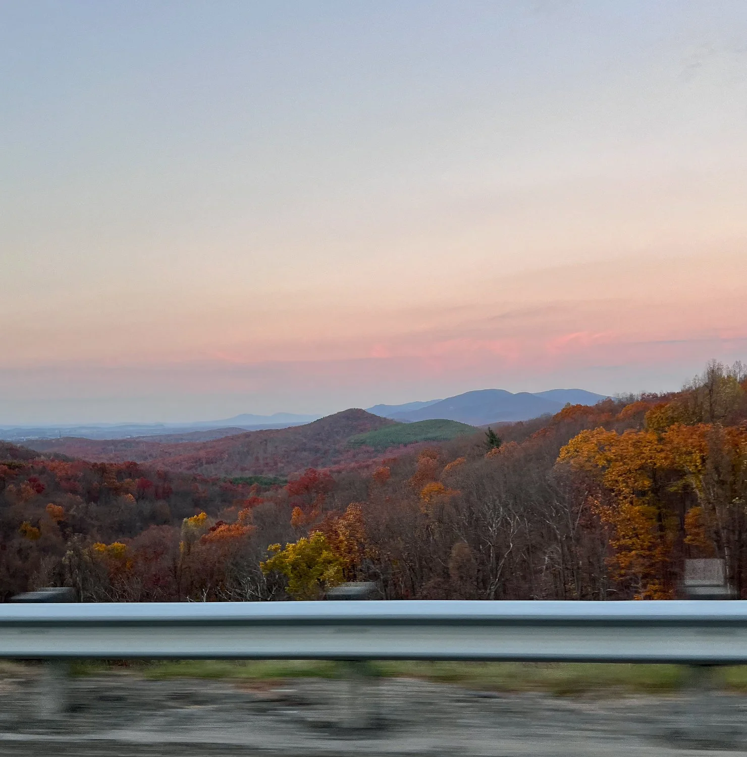 I visited them regularly as we aged. On those drives to my childhood home—crossing Afton Mountain each time—I started photographing the same scene from the car. This simple, repeated act gave me something to focus on beyond hospital visits and caretaking. The images became a quiet record, holding movement, memory, and the emotional weight of going back.